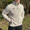 • The sherpa fleece jacket is a relaxed, boxy fit, designed to be worn over other layers of clothing.