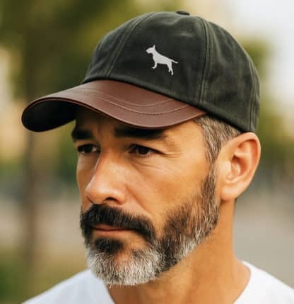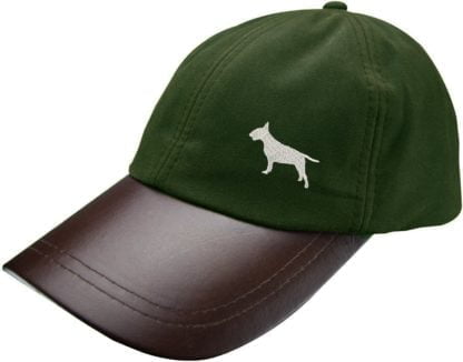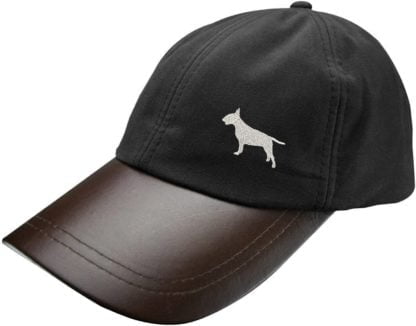 Bull Terrier Owner Clothing Gifts, Waxed Cotton Leather Peak Waterproof Baseball Cap Hat From The House Of Dog.