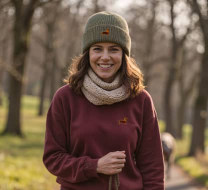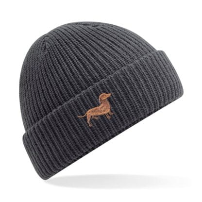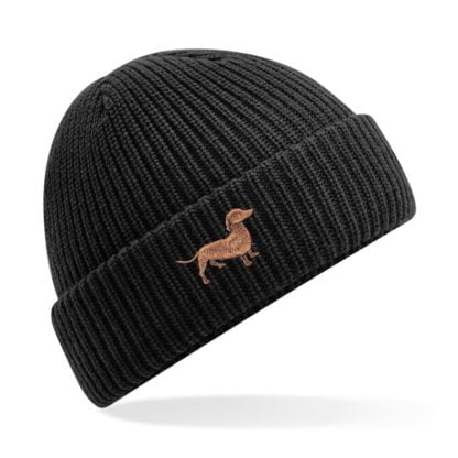 Warm, fleece lined, water repellent beanie with the Dachshund embroidered design.