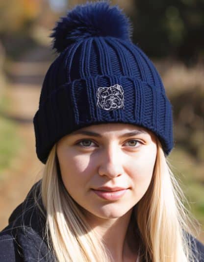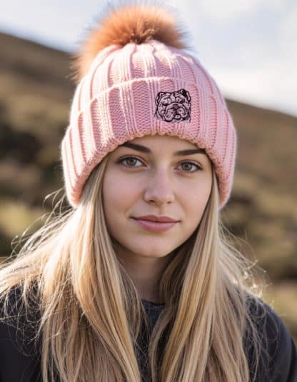 English Bulldog Owner Clothing Gifts, Faux Fur Pom Pom Super Soft Chunky Knit Embroidered Beanie From The House Of Dog.