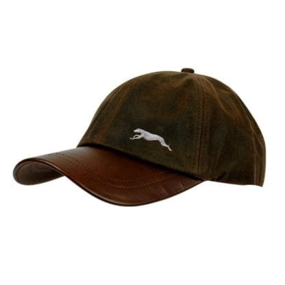 Greyhound Lurcher Owner Clothing Gifts, Waxed Cotton Leather Peak Waterproof Baseball Cap From The House Of Dog.