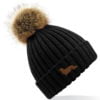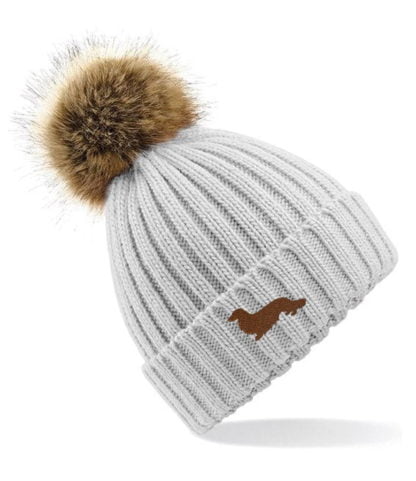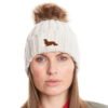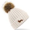 Long Haired Dachshund Daxi Clothing Gifts, Faux Fur Pom Pom Chunky Knit Embroidered Beanie From The House Of Dog.