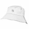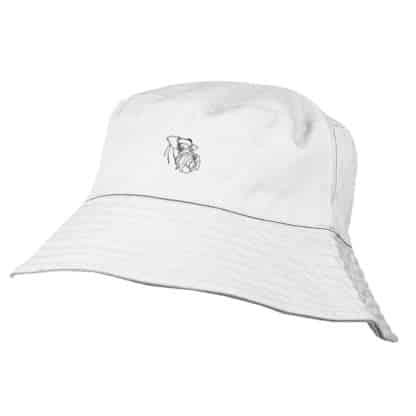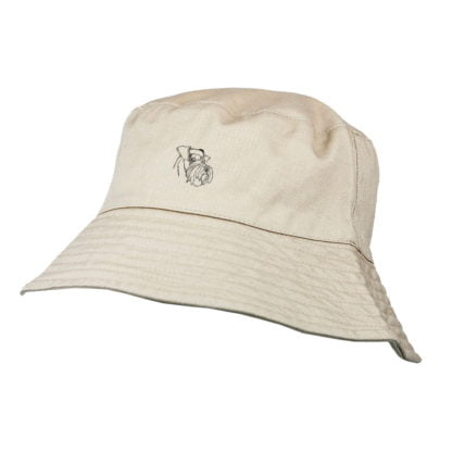 A classic washed chino cotton bucket hat. Embroidered design and white cotton lining inside.